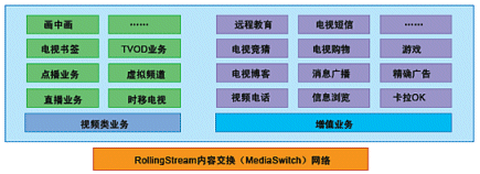 奔流(RollingStream)系統(tǒng)不僅僅支持以LiveTV、Timeshift-TV、VOD、TVOD等為基礎(chǔ)的各項(xiàng)功能,而且具有良好的功能上的可擴(kuò)展性,在此平臺(tái)上可以支持眾多豐富多彩的增值互動(dòng)業(yè)務(wù)。基于奔流(RollingStream)具有無限的業(yè)務(wù)增長空間,如下圖所示意: