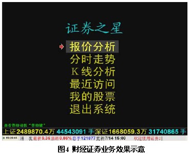 斯達(dá)康奔流系統(tǒng)的“證券之星”業(yè)務(wù)基于電視界面提供用戶一種易接受的信息讀取方式,可以有效地滿足這部分人群的需要。用戶通過(guò)遙控器和電視,可實(shí)現(xiàn)股票大盤(pán)行情顯示、個(gè)股實(shí)時(shí)行情分析、各種走線趨勢(shì)圖的瀏覽等功能。