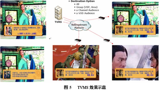 TVMS可以支持用戶間通過(guò)電視屏幕顯示手機(jī)短信息;支持向全頻道發(fā)送信息,如政府公告、天氣預(yù)警、水電費(fèi)用催繳等等;也可以向特定人群發(fā)送廣告信息;廣電運(yùn)營(yíng)商可通過(guò)該功能開(kāi)展互動(dòng)娛樂(lè)業(yè)務(wù)。