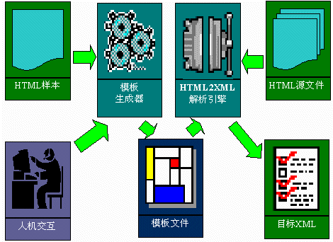 HTML2XML1.0中包括了兩個工具:HTML2XML模板生成器和HTML2XML解析引擎。通過該HTML2XML模板生成器的GUI界面和HTML2XML解析引擎,將HTML文件中的<Table>標記中的數(shù)據(jù),根據(jù)指導性文件,轉(zhuǎn)換成XML格式數(shù)據(jù),供其他應用程序進行進一步處理。
