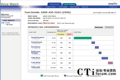 電話交易監(jiān)測(cè): 一個(gè)電話交易由一條指定的路由組成,呼叫者穿越這條路由,通過(guò)按鍵或語(yǔ)音完成一項(xiàng)自助服務(wù)的交易。對(duì)于每一個(gè)通話路由,Voice Watch被設(shè)計(jì)成通過(guò)撥號(hào)或者語(yǔ)音指定這條路由完成一項(xiàng)IVR自助服務(wù)的交易,例如賬戶(hù)余額檢查,賬單支付等。電話交易監(jiān)測(cè)管理自助服務(wù)的可用性和性能,也測(cè)量承載網(wǎng)的性能和交換機(jī)、IVR、語(yǔ)音識(shí)別和主機(jī)/數(shù)據(jù)庫(kù)的響應(yīng)時(shí)間。