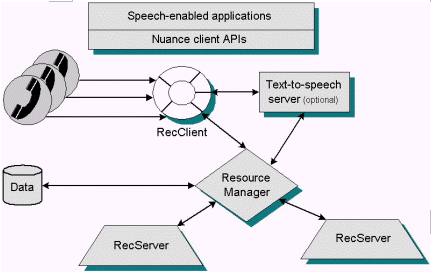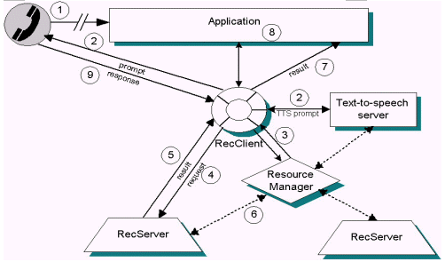 下圖說(shuō)明RecServer和其它Nuance系統(tǒng)組件之間的交互情況。在每個(gè)交互過(guò)程中,由資源管理器建立連接,但RecServer和其它組件間的交互是直接進(jìn)行的。