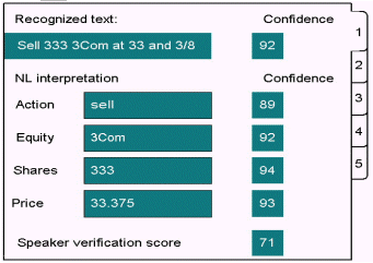 也可使用外部的應(yīng)用知識(shí)內(nèi)容來(lái)確定多結(jié)果中的哪一個(gè)是有效的。例如,經(jīng)紀(jì)業(yè)務(wù)應(yīng)用程序,它的用戶投資隨時(shí)間變化而變化。系統(tǒng)可使用簡(jiǎn)單的語(yǔ)法來(lái)識(shí)別股票證券的名稱(chēng)。識(shí)別時(shí),系統(tǒng)產(chǎn)生一個(gè)最佳前N個(gè)股票名稱(chēng)的清單,標(biāo)明假設(shè)的股票證券名稱(chēng)。應(yīng)用程序然后將每個(gè)清單項(xiàng)目(由最佳到最差)和現(xiàn)有股票證券名稱(chēng)進(jìn)行比較,從而為該用戶找到可能性最大的一個(gè)。下圖展示的是這些多結(jié)果情況,每個(gè)結(jié)果都可能有它自身的已被識(shí)別的文本、NL解釋和置信度分值。在這一例中,請(qǐng)求了五個(gè)識(shí)別結(jié)果。