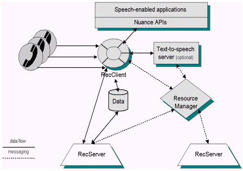 Nuance系統(tǒng)基于開(kāi)放式客戶/服務(wù)機(jī)結(jié)構(gòu),特別為大型應(yīng)用程序所需的健壯性和可伸縮性而設(shè)計(jì)。呼叫者的講話由客戶端收集,而識(shí)別和鑒別處理的負(fù)載被平均分配到網(wǎng)絡(luò)上的多個(gè)分開(kāi)的服務(wù)器上。