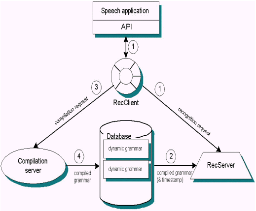 5.當(dāng)RecServer接收到另外的請(qǐng)求時(shí),使用動(dòng)態(tài)語(yǔ)法時(shí)間戳檢查數(shù)據(jù)庫(kù)中的語(yǔ)法是否已經(jīng)更新。如果該語(yǔ)法已經(jīng)改變,則RecServer更新其本地副本。否則,它利用緩存的副本處理識(shí)別請(qǐng)求。