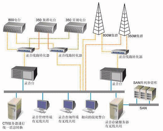 系統(tǒng)對(duì)無線通訊部分的800M TETRA集群、350M模擬集群、TETRA基地臺(tái)、350M常規(guī)基地臺(tái)、350M集群電臺(tái)等進(jìn)行錄音。