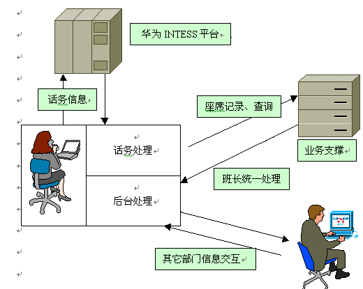 該系統(tǒng)在鐵通CRIS 平臺(tái)上運(yùn)行,前端接入采用華為CC08-A型排隊(duì)機(jī),華為INTESS平臺(tái),集成正邦高科座席軟件。完成企業(yè)業(yè)務(wù)咨詢(xún)、投訴建議的受理、產(chǎn)品訂購(gòu)、外呼調(diào)查等業(yè)務(wù),并針對(duì)各業(yè)務(wù)的特色規(guī)劃了企業(yè)的業(yè)務(wù)流程。正邦高科客戶(hù)服務(wù)系統(tǒng)的坐席軟件,和華為INTESS采用緊耦合方式將話務(wù)信息和業(yè)務(wù)信息結(jié)合在一起,便于統(tǒng)計(jì)分析,制訂客戶(hù)服務(wù)中心的運(yùn)營(yíng)策略。在后臺(tái)業(yè)務(wù)管理系統(tǒng)中,客戶(hù)服務(wù)系統(tǒng)設(shè)計(jì)了便于分析業(yè)務(wù)的一系列統(tǒng)計(jì)報(bào)表,使企業(yè)可以方便地對(duì)銷(xiāo)售過(guò)程進(jìn)行跟蹤和定單派發(fā)。