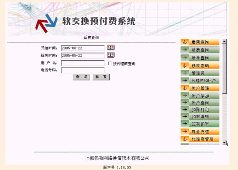 - 話費(fèi)查詢:可根據(jù)用戶名稱(代理商名稱)、主叫號碼(或號碼段)、起止時間等條件快速查詢通話費(fèi)用。