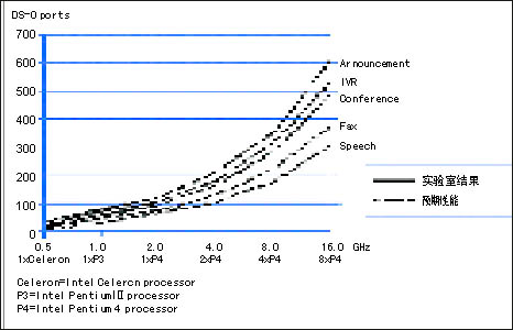圖1顯示了主要的通信媒體處理功能的實(shí)驗(yàn)測量結(jié)果和預(yù)期性能。Intel 編制的HMP軟件,在Intel的從566 MHz 到 2 GHz的Celeron和 Pentium 處理器上,已經(jīng)對語音宣告、IVR和會議算法完成了實(shí)現(xiàn)、優(yōu)化和測試。圖1中的實(shí)線表示實(shí)驗(yàn)室中的測試結(jié)果。Intel的目標(biāo)是實(shí)現(xiàn)這些算法,并擴(kuò)展到更高速的Intel Pentium處理器,雙路、四路、甚至八路Intel Pentium處理器、Intel Xeon處理器以及Intel Itanium處理器。圖1中的虛線顯示了Intel所期望的在未來的實(shí)現(xiàn)中將得到的結(jié)果。目前,HMP的版本主要以Windows為主,很快就會推出Linux版本。從根本上說,HMP最適合用在純IP的環(huán)境,也可通過擴(kuò)展到多個服務(wù)器實(shí)現(xiàn)密度的提升。