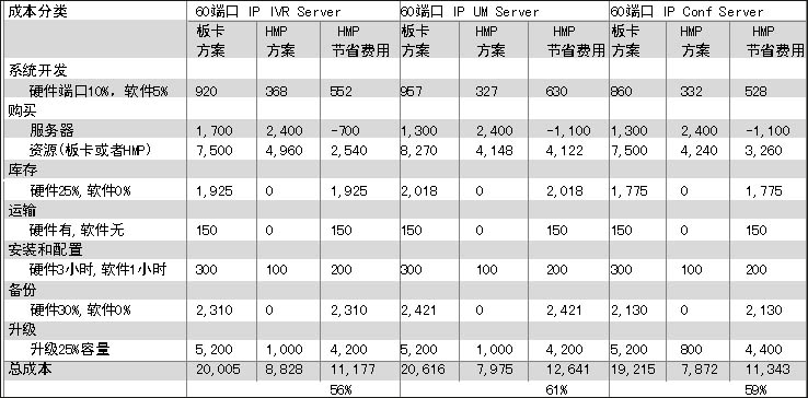在眾多好處當(dāng)中,對用戶最有吸引力的無疑是節(jié)省成本。張怡國特別強(qiáng)調(diào),對一個應(yīng)用系統(tǒng)而言,成本的計算不應(yīng)該單以產(chǎn)品端口購買價格考核,而應(yīng)該是系統(tǒng)總的建設(shè)成本,包括產(chǎn)品購買成本、服務(wù)器成本、運(yùn)輸、安裝、庫存、升級等多項(xiàng)費(fèi)用;贖MP1.1版本,張怡國作了一個比較,以60端口IP IVR 60、端口IP UM或者60路會議為例,和語音板卡處理方式相比,基于HMP軟件實(shí)現(xiàn)能有近60%的成本節(jié)省,其中采購能節(jié)省20%,庫存節(jié)省20%,備份節(jié)省20%,升級節(jié)省近40%。