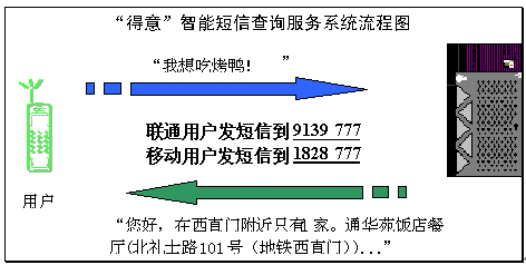 2004年4月15日和4月20日,擁有完全自主知識產權的語音與語言技術開發(fā)商和技術提供商北京得意音通技術有限責任公司(得意公司),在國際上率先把中文自然語言理解技術應用在中國聯通和中國移動短信服務平臺上,結合《精品購物指南》報社權威、全面的信息資源,開通了北京地區(qū)餐飲領域智能短信查詢服務(簡稱智能短信),并將進一步支持互聯網平臺和WAP平臺,陸續(xù)開通更豐富和更實用的智能信息服務。