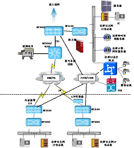 目前許多公安系統(tǒng)雖然采用具有IP語(yǔ)音功能的路由設(shè)備組建網(wǎng)絡(luò),但在業(yè)務(wù)語(yǔ)音交流通常還通過(guò)PBX集團(tuán)交換機(jī)走電信PSTN/ISDN電話網(wǎng),這樣無(wú)法節(jié)省電話費(fèi)用,反而增加了辦公費(fèi)用。邁普IP語(yǔ)音解決方案采用了邁普MyPower VG2000IP語(yǔ)音網(wǎng)關(guān)和邁普以太網(wǎng)IP電話進(jìn)行改造。在整個(gè)網(wǎng)點(diǎn)語(yǔ)音終端全部設(shè)備選用經(jīng)濟(jì)型邁普以太網(wǎng)IP電話機(jī),它采用雙以太口設(shè)計(jì),使網(wǎng)絡(luò)無(wú)需重新布線,同時(shí)也可使用已有的路由器上IP語(yǔ)音模塊;邁普以太網(wǎng)IP電話機(jī)之間的話音通信通過(guò)邁普呼叫管理服務(wù)器集中控制。在主體IP網(wǎng)絡(luò)中,邁普IP語(yǔ)音網(wǎng)關(guān)放置于中心機(jī)房作為傳統(tǒng)PSTN的出口,可以通過(guò)VOS接口、E1接口(中國(guó)一號(hào)信令)、E&M接口等多種方式接入公安PBX,將PSTN線路傳來(lái)的時(shí)分話音或傳真信息進(jìn)行分組和壓縮,轉(zhuǎn)換成IP數(shù)據(jù)包,通過(guò)路由設(shè)備路由到目的地;在沒(méi)有PBX的公安機(jī)房,邁普IP語(yǔ)音網(wǎng)關(guān)可以提供32路的模擬用戶(hù)接口,可以完全替代傳統(tǒng)PBX并接入PSTN,并提供額外功能,如圖中虛線所示;整個(gè)方案還可以針對(duì)公安用戶(hù)特殊需求"定做"特色功能,例如緊急告警等方便日常辦公。