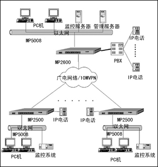 各分店用一臺MP2500路由器,配雙以太口,一個口接MP5008交換機組建本地以太網,一個口接廣電的10MVPN,以實現(xiàn)本地以太網與總店、各分店、配送中心等連接。配1個RM2-1VoIP單路IP電話模塊,直接下掛普通電話機,以實現(xiàn)全網IP電話免費,同時還可以通過總店的程控交換機與市話連接。分店以太網中,掛有監(jiān)控系統(tǒng)、PC機、醫(yī)保讀卡器等。模塊化設計提供了網絡擴展的空間,滿足未來業(yè)務的發(fā)展。邁普的路由器提供多種模塊,用戶可以根據實際需要加裝不同的模塊,滿足不同環(huán)境的使用要求。模塊化設計可以極大地方便設備的維護,并為今后的網絡升級改造提供足夠的預留空間。