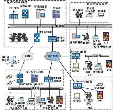 VG2000 IP電話語(yǔ)音網(wǎng)關(guān),支行采用以太網(wǎng)IP數(shù)字電話機(jī),網(wǎng)點(diǎn)則根據(jù)需要可以采用IP數(shù)字電話機(jī)或普通電話機(jī)。只要網(wǎng)點(diǎn)安裝的路由器是MP2600/2500產(chǎn)品,就可以通過(guò)在路由器上加裝IP電話模塊,直接實(shí)現(xiàn)普通電話機(jī)的IP話音接入。