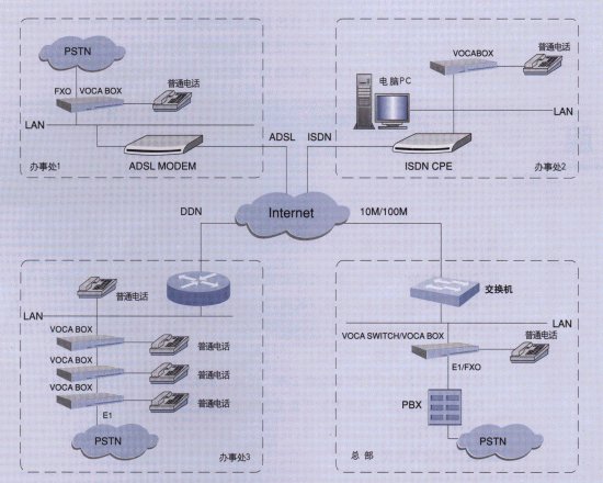 在總部、各個分公司、辦事處按照容量的大小可以安裝多臺VOCABOX,并利用VOCABOX自帶的FXO接口與本地PSTN網(wǎng)互通。