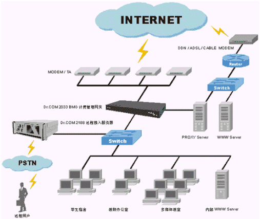 另外,Dr.COM 2033 BMG計(jì)費(fèi)管理網(wǎng)關(guān)本身提供了多種通信線路的接口,支持普通撥號(hào)線、ISDN到專(zhuān)線等各種線路。并集成了包過(guò)濾的防火墻,以及采用NAT地址轉(zhuǎn)換協(xié)議,保證了校園網(wǎng)內(nèi)的安全。
