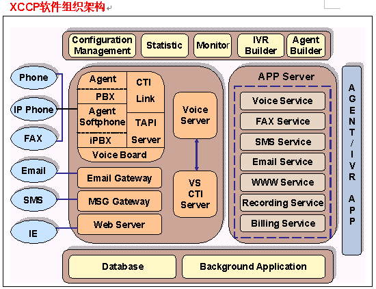 XCCP中自動語音菜單是由VoiceXML語言組成的,這些VoiceXML頁面產(chǎn)生和存放都是在應(yīng)用服務(wù)器上進(jìn)行的;應(yīng)用服務(wù)器還存放應(yīng)用邏輯組件或中間件,進(jìn)行事務(wù)處理,IVR和座席子系統(tǒng)的業(yè)務(wù)處理都是通過這些事務(wù)處理來實(shí)現(xiàn)的;同后臺業(yè)務(wù)系統(tǒng)和數(shù)據(jù)庫通信,也是通過該模塊進(jìn)行的。