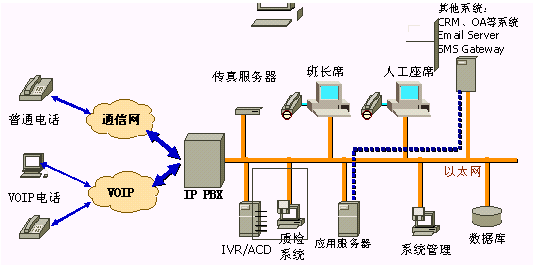 IP PBX系統(tǒng)代替?zhèn)鹘y(tǒng)PBX交換機(jī)系統(tǒng),實(shí)際上是一個(gè)SIP或H.323交換機(jī),內(nèi)部分機(jī)采用純IP電話,提供呼叫路由、話務(wù)員分組管理、呼叫控制等功能,支持市場上主流IP