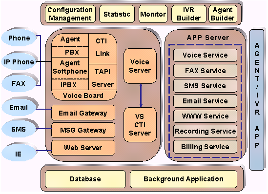 Server負(fù)責(zé)將這些信息收集在一起,供應(yīng)用服務(wù)器使用;同時(shí)VoiceServer和CTI Server同時(shí)將各種數(shù)據(jù)和信息進(jìn)行解釋,將任務(wù)提交給各種硬件和接入設(shè)備執(zhí)行。