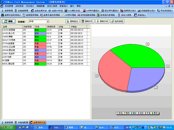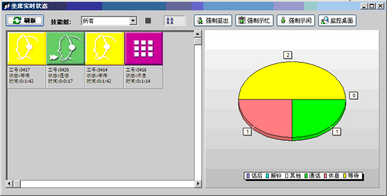 當(dāng)前座席狀態(tài):能夠提供座席的狀態(tài)表示,狀態(tài)持續(xù)時間,對應(yīng)的技能組,對應(yīng)的分機號碼,對應(yīng)的IP地址等信息?梢詫θ魏我粋座席進(jìn)行強制簽出、強制示忙、強制示閑操作?梢詫θ我庾M(jìn)行屏幕監(jiān)控操作(無需任何第三方軟件)。