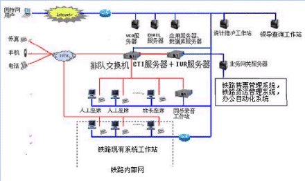 鐵路客戶服務(wù)中心系統(tǒng)主要是由帶語音板卡的計算機或排隊交換機、CTI服務(wù)器、IVR服務(wù)器、應(yīng)用服務(wù)器/數(shù)據(jù)庫服務(wù)器、人工座席系統(tǒng)等硬件設(shè)備和應(yīng)用軟件組成。它以電話服務(wù)為主要服務(wù)方式、結(jié)合計算機信息系統(tǒng)的資料數(shù)據(jù),為客戶提供全方位的服務(wù),包括業(yè)務(wù)查詢、業(yè)務(wù)咨詢、業(yè)務(wù)受理、投訴和建議、市場調(diào)查等功能。