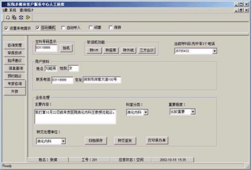 。。系統(tǒng)通過計(jì)算機(jī)語音自動應(yīng)答設(shè)備或人工座席與患者建立聯(lián)系,檢索業(yè)務(wù)數(shù)據(jù)庫,既可以直接播放病人所需的咨詢信息、醫(yī)療費(fèi)用明細(xì)查詢、遠(yuǎn)程就診掛號,又可以接受患者的投訴舉報(bào)或求助,向醫(yī)院相關(guān)科室或負(fù)責(zé)人轉(zhuǎn)交相應(yīng)投訴建議或求助信息,使問題能夠在最快的時(shí)間內(nèi)得到最好的解決,這種交互式的服務(wù)模式和服務(wù)手段保證了溝通的靈活性和高效性,提高了患者對醫(yī)院的滿意度和信任度。