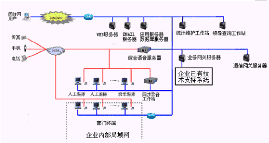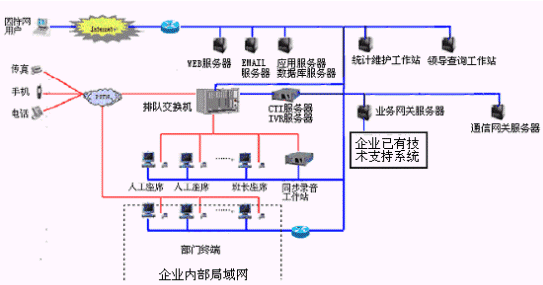 本系統(tǒng)物理結構由帶語音板卡的工控機或排隊交換機、CTI服務器、IVR(交互式語音應答)/IFR(交互式傳真應答)服務器、業(yè)務代表座席(邏輯上分為:普通業(yè)務代表座席、專家座席等)、班長座席、統(tǒng)計維護管理工作站、因特網(wǎng)(WEB)服務器、電子郵件(EMAIL)服務器、數(shù)據(jù)庫/應用服務器、錄音留言工作站、領導查詢工作站、業(yè)務網(wǎng)關服務器、通信網(wǎng)關、網(wǎng)絡系統(tǒng)等構成。