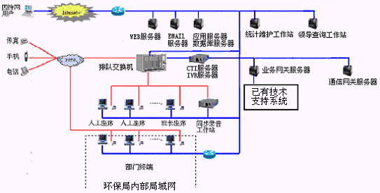 該12369環(huán)保熱線系統(tǒng)主要是由具有排隊功能的交換機或帶語音板卡的工控機、CTI服務(wù)器、IVR(交互式語音應(yīng)答)/IFR(交互式傳真應(yīng)答)子系統(tǒng)、人工座席子系統(tǒng)、應(yīng)用服務(wù)器、數(shù)據(jù)庫服務(wù)器、業(yè)務(wù)網(wǎng)關(guān)子系統(tǒng)、通信網(wǎng)關(guān)子系統(tǒng)等硬件設(shè)備和應(yīng)用軟件組成。