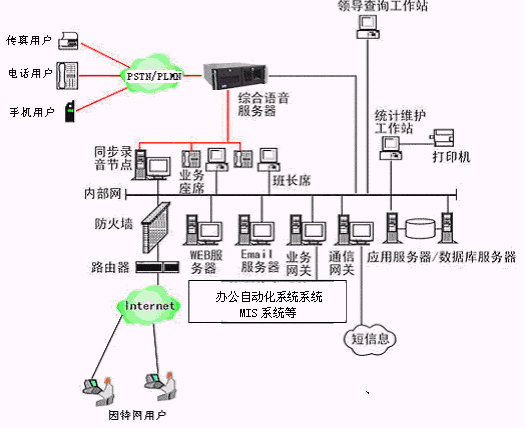 勞動局多媒體呼叫中心系統(tǒng)主要是由智能型可編程交換機或帶語音板卡的工控機或排隊交換機、CTI服務(wù)器、IVR(交互式語音應(yīng)答)/IFR(交互式傳真應(yīng)答)子系統(tǒng)、人工座席子系統(tǒng)、應(yīng)用服務(wù)器、數(shù)據(jù)庫服務(wù)器、業(yè)務(wù)網(wǎng)關(guān)子系統(tǒng)、WEB服務(wù)器、電子郵件服務(wù)器、防火墻、通信網(wǎng)關(guān)等硬件設(shè)備和應(yīng)用軟件組成。