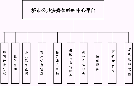 客戶利用電話、傳真、電子郵件、因特網(wǎng)、手機、短消息等進入城市公共多媒體呼叫中心平臺,本系統(tǒng)依托現(xiàn)有各專業(yè)呼叫中心/使用城市公共多媒體呼叫中心平臺租賃服務(wù)的企事業(yè)單位的各類業(yè)務(wù)技術(shù)支持系統(tǒng)和網(wǎng)絡(luò)系統(tǒng),通過人工受理或自動語音服務(wù)等方式全天24小時不間斷地為客戶提供各種服務(wù)。