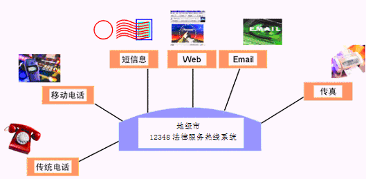 居民利用電話、傳真、手機(jī)等撥打某一特服號(hào)碼(如12348)進(jìn)入地級(jí)市法律服務(wù)熱線系統(tǒng),本系統(tǒng)依托地級(jí)市司法行政部門/法院各類業(yè)務(wù)技術(shù)支持系統(tǒng)和網(wǎng)絡(luò)系統(tǒng),通過人工受理或自動(dòng)語音服務(wù)等方式全天24小時(shí)不間斷地為人民群眾提供各種法律服務(wù);形成了對(duì)外服務(wù)于百姓的無形窗口,對(duì)內(nèi)管理、分析、決策系統(tǒng)相結(jié)合的多媒體呼叫中心。