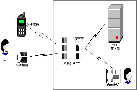 如圖1所示,在一個典型的應(yīng)用環(huán)境里,TIDS系統(tǒng)可與公司或單位的電話交換機通過一條或若干條模擬電話線相連。未來TIDS的版本將可支持E1/T1數(shù)字中繼線。可以將TIDS設(shè)置為缺省的電腦話務(wù)員,即用戶呼叫直接由TIDS系統(tǒng)處理;也可以分配一個分機號碼給TIDS,當用戶需要時可撥該號碼使用TIDS服務(wù)。在后一種情況下,最好是在交換系統(tǒng)的問候語中提示用戶如何撥打TIDS系統(tǒng)。