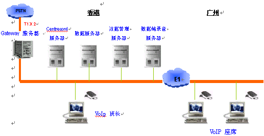 于本年一月初,基于Concerto Software平臺建設的中港跨境呼叫中心正式由本公司替GIS于香港及廣州開通。初期于廣州之座席數(shù)目為24。廣州與香港間透過1條E1專線連接。(結(jié)構(gòu)如下)