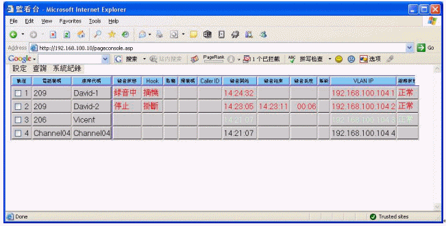 監(jiān)看臺:系統(tǒng)登入后的主畫面,可以監(jiān)控各路電話的當(dāng)前使用情況(包括來電號碼、去電號碼、振鈐次數(shù)、錄音開始時間、錄音結(jié)束時間、線路狀況等信息)。并可以實(shí)現(xiàn)對任意通話的網(wǎng)絡(luò)實(shí)時監(jiān)聽。