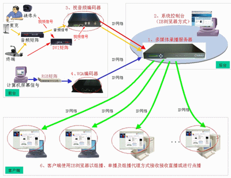 通過服務(wù)器內(nèi)置單播或組播功能方式將會議現(xiàn)場的視頻、音頻、計算機(jī)屏幕上的圖像內(nèi)容和過程在網(wǎng)絡(luò)上進(jìn)行實(shí)時直播,用戶可通過IE瀏覽器登錄服務(wù)器實(shí)時接收會議現(xiàn)場的視頻、音頻和計算機(jī)動態(tài)屏幕內(nèi)容,也可以選擇性的直播部分媒體流,直播延時小。同時系統(tǒng)獨(dú)家支持組播代理功能,無須更改網(wǎng)絡(luò)設(shè)備設(shè)置的即可實(shí)現(xiàn)跨網(wǎng)段的組播。