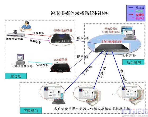如上圖所示,硬件系統(tǒng)采用了前后臺(tái)分離的模式,前端的視音頻編碼器將從終端上采集的視音頻信號(hào)與VGA編碼器采集的VGA信號(hào)進(jìn)行編碼,通過(guò)內(nèi)部專屬網(wǎng)絡(luò)傳輸?shù)胶笈_(tái)機(jī)房的錄播服務(wù)器中,通過(guò)服務(wù)器內(nèi)部功能模塊,不僅將整個(gè)會(huì)議或者培訓(xùn)現(xiàn)場(chǎng)的視音頻與電腦桌面內(nèi)容同步錄制保存在專屬硬盤中,同時(shí)將上述采集內(nèi)容實(shí)時(shí)轉(zhuǎn)發(fā)直播到用戶局域網(wǎng)中。通過(guò)錄播系統(tǒng)的身份驗(yàn)證機(jī)制,通過(guò)連接到網(wǎng)絡(luò)中的任意一臺(tái)PC即可接收直播的內(nèi)容。同時(shí)錄制保存在專屬硬盤上的內(nèi)容還可以后期點(diǎn)播回訪(需身份驗(yàn)證)。