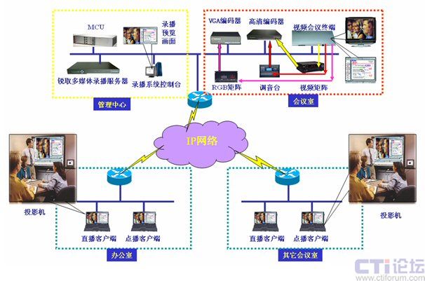 如圖所示:多媒體錄播服務(wù)器放置在管理中心,高清編碼器(采集高清視頻及聲音)及VGA編碼器(采集雙流信號)放置在會議室,客戶端可以是網(wǎng)絡(luò)內(nèi)的任意一臺計算機。整個系統(tǒng)簡單明了,分布靈活,部署簡單,系統(tǒng)只要連接了信號線,配置了IP地址即可投入使用,無須專業(yè)布線。各部分配置如下: