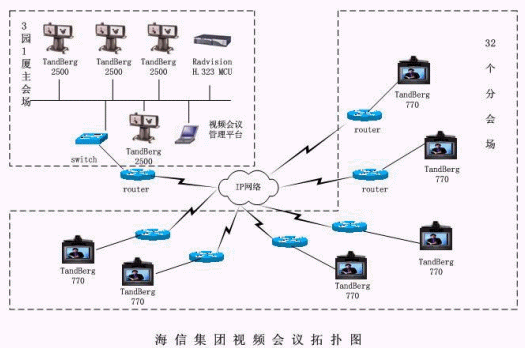 山東海信集團(tuán)有限公司會(huì)議電視項(xiàng)目以海信大廈為中心,覆蓋各個(gè)省的35個(gè)分支機(jī)構(gòu)。充分利用自己網(wǎng)絡(luò)資源的優(yōu)勢,采用ITU(國際電聯(lián))的H。323標(biāo)準(zhǔn)。于-2004-年初經(jīng)過系統(tǒng)方案的征集、產(chǎn)品的反復(fù)測試,最終確定了由華夏科技代理的挪威TANDBERG的視頻終端,并于2004年6月份簽訂了一期采購合同,共計(jì)36套視頻終端。