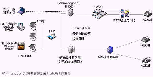 FAXmanager 2.5支持網(wǎng)絡(luò)傳真發(fā)送,具有內(nèi)嵌的網(wǎng)絡(luò)傳真服務(wù),價(jià)格比IP電話更加低廉。FAXmanager 2.5企業(yè)郵件管理系統(tǒng)有支持普通Modem的普通版本Lite版本,最多可以支持4只Modem,在局域網(wǎng)中的應(yīng)用請(qǐng)參見如下示意圖: