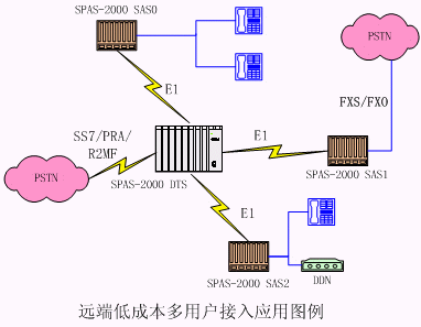 tyutSPAS-2000可編程交換機通過E1可以支持多個遠(yuǎn)端模塊。遠(yuǎn)端模塊采用SPAS-2000 SAS框,可以帶多種用戶接口:普通模擬用戶、DDN、環(huán)路中繼用戶;通過SPAS-2000 DTS對外提供各種信令接入。適合多點接入組網(wǎng),組網(wǎng)成本低廉。 在示意圖中,SAS表示遠(yuǎn)端用戶接入框,它可以通過需要選擇接入模擬用戶:FXO/FXS、E/M、普通模擬用戶和DDN。中心為SPAS可編程交換機,可以通過 SS7/PRA/R2MF進行匯接轉(zhuǎn)換。
