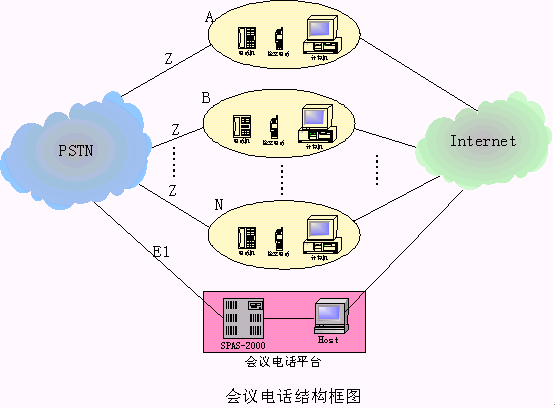中:SPAS-2000作為組成會議電話平臺的主要交換平臺,Host作為業(yè)務(wù)管理平臺,它們共同組成會議電話平臺.A,B,N等作為使用會議電話平臺的用戶,它們有固定電話(作為會議電話使用),手機和電腦.它們均可作為某個會議電話的主持人.