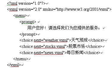 下面是一個(gè)VoiceXML簡(jiǎn)單例子。當(dāng)用戶與電話語音系統(tǒng)接通以后,將會(huì)聽到語音合成的提示"用戶您好!請(qǐng)選擇我們?yōu)槟峁┑姆⻊?wù):" 。當(dāng)用戶說"股票市場(chǎng)"