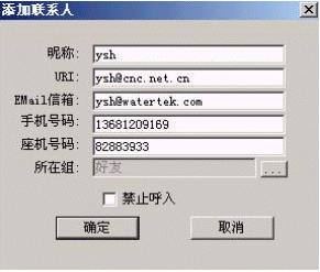 可以在這里進(jìn)行所給的各項操作,選擇添加聯(lián)系人,輸入某個用戶的各項個人信息,確認(rèn)后,這個用戶就會被添加到相應(yīng)的組中,并且會顯示出該用戶狀態(tài)。