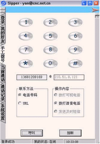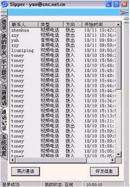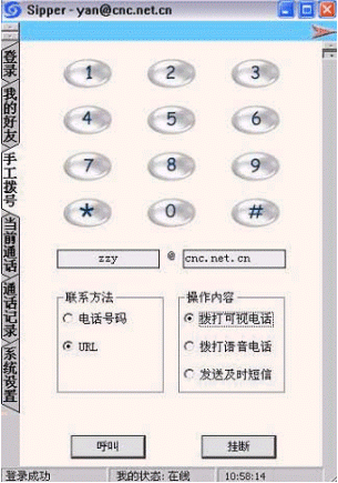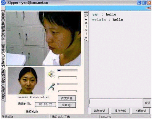 點擊后會出現(xiàn)對話窗口,同時在對方的機(jī)器上會出現(xiàn)你的呼叫請求,如果對方"接收"了你的請求,則兩個人的語音對話開始,雙方可以互相聽到聲音,沒有圖象,可以同時進(jìn)行短信交流。