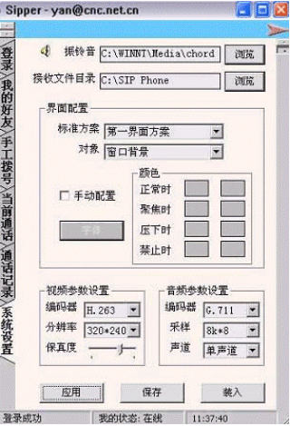 在該窗口中可以對系統(tǒng)的各項參數(shù)進(jìn)行設(shè)置:振玲音、接受文件目錄、界面配色方案、大小視頻等。