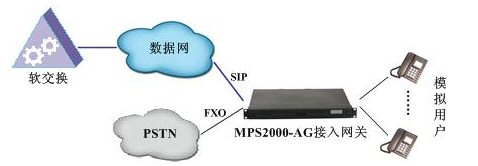 MPS2000-AG接入網關可提供多種接口,如IP接口、FXS、FXO等,使其具有強大的組網能力。其組網如下所示。