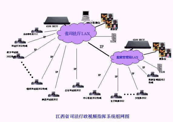 江西司法視頻會議系統的拓撲結構如圖所示。整個視頻會議系統為星型拓撲結構,其中二級網以省司法廳和省監(jiān)獄管理局為主會場,放置2個MCU;另外,包括11個地市司法局的分會場(南昌、九江、贛州、吉安、撫州、鷹潭、萍鄉(xiāng)、新余、上饒、景德鎮(zhèn)、宜春),14個監(jiān)獄和農場分會場,傳輸網絡為2M IP網絡,視頻會議協議為H.323;司法局和監(jiān)獄管理局也可以單獨成網,在分別依托省司法廳和省監(jiān)獄管理局MCU的情況下,各地市司法局或監(jiān)獄系統可與省司法廳或省監(jiān)獄管理局單獨進行雙向的視頻會議,整個系統具有很強的靈活性和擴展性。