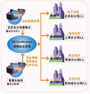 在會(huì)議中,副總經(jīng)理使用電子白板向各位主管說明了公司的整體規(guī)劃,上海分公司經(jīng)理還通過程序共享功能,將自己寫的某地市場(chǎng)開拓規(guī)劃書初稿共享出來,與所有與會(huì)者討論;