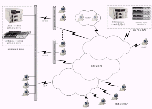 朝陽區(qū)政府的中心機房里放置多臺FVC公司的Conference Server,實現(xiàn)支持上千個并發(fā)用戶的超媒體會議支撐處理平臺;在中心機房放置一套完整的超媒體會議管理系統(tǒng)(Click