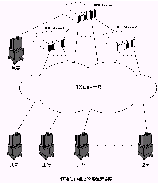 與海關(guān)ATM網(wǎng)一樣,海關(guān)電視會議系統(tǒng)也是以總署為中心的星形結(jié)構(gòu)。總署配置有三個相互級連的MCU,其中一個為Master,另外兩個為Slaver,分署和各海關(guān)的會議終端設(shè)備通過ATM網(wǎng)的PVC信道分別連接到Master或Slaver